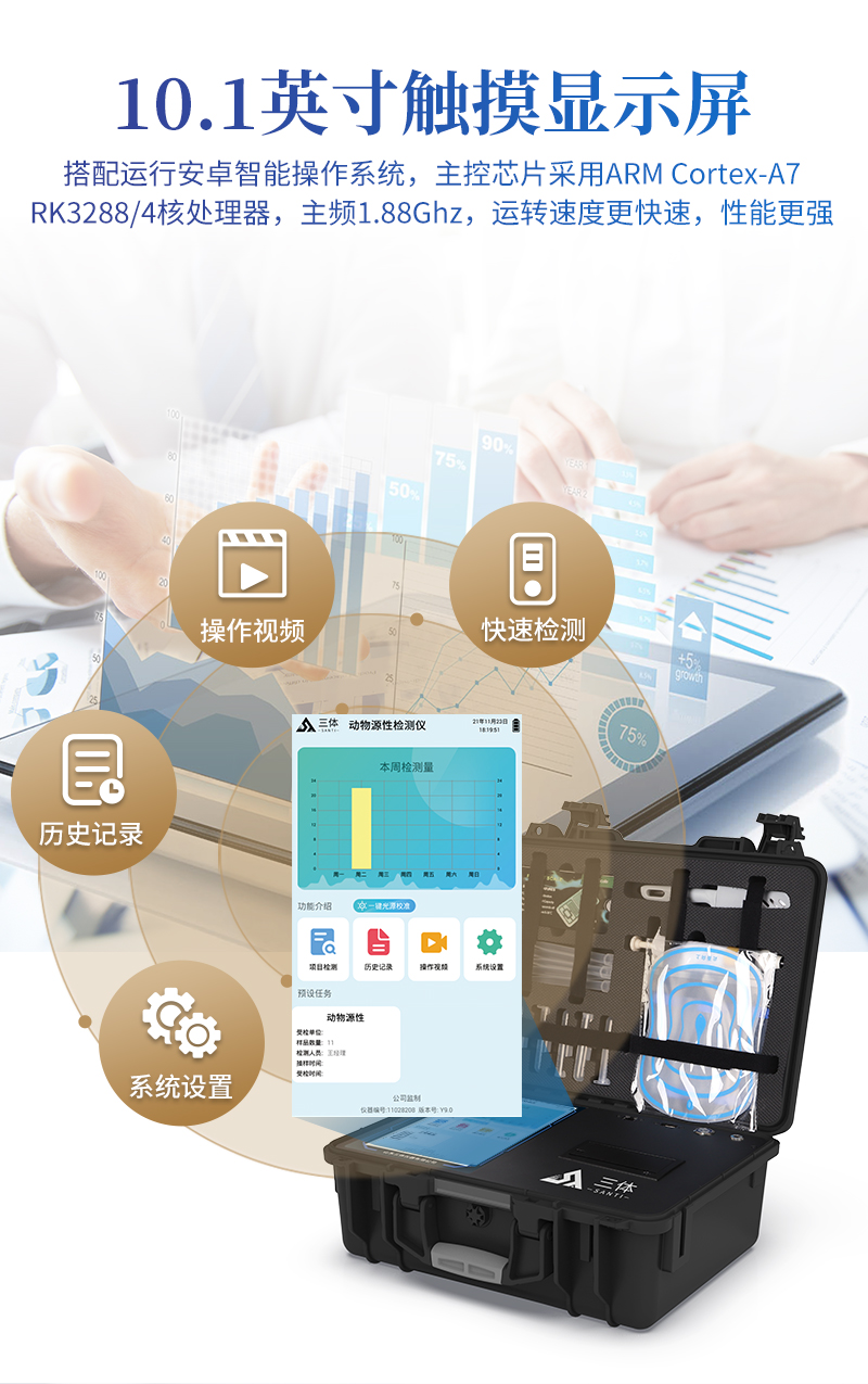 1、儀器采用10.1英寸液晶觸摸屏顯,搭配運行安卓智能操作系統,主控芯片采用ARM Cortex-A7,RK3288/4核處理器,主頻1.88Ghz,運轉速度更快速,性能更強。