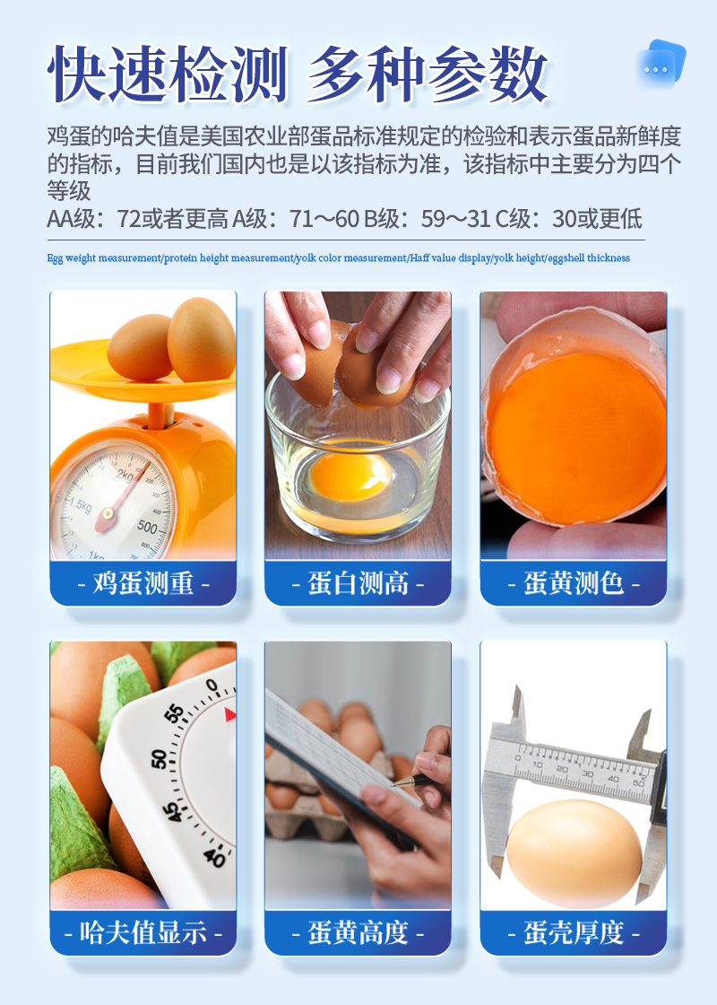 雞蛋品質分析儀技術指標:雞蛋測重,蛋白測高,蛋黃測色,哈夫值顯示,蛋黃高度,蛋殼厚度等,可進行雞蛋等級計算。雞蛋的哈夫值是美國農業部蛋品標準規定的檢驗和表示蛋品新鮮度的指標,目前我們國內也是以該指標為準,該指標中主要分為四個等級,AA級:72或者更高;A級:71~60;B級:59~31;C級:30或更低。