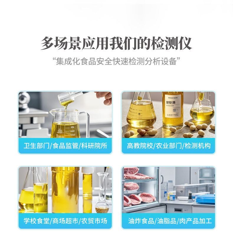 廣泛應(yīng)用于質(zhì)量監(jiān)督檢驗、工商管理、油炸食品生產(chǎn)基地、食藥監(jiān)局、衛(wèi)生部門、肉制品食品深加工企業(yè)、商場超市、各大食品安全監(jiān)測系統(tǒng)等單位使用。